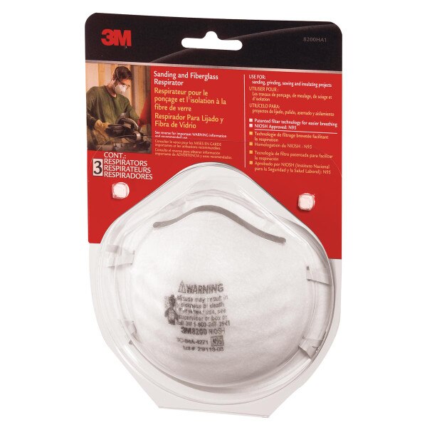 3M Sanding and Fiberglass N95 Respirator Mask, 3 Pack SKU 175265 SELL UNITS: Each $7.99 Quantity discounts available QuantityPrice (0)No Reviews yet Ship 49 Available Pickup in Store - FREE! Select Store to check availability. Selected Pickup Location Quantity -+ Add to Cart Details Sanding and fiberglass respiratorUse for sanding, grinding, sawing and insulating projectsPatented filter technology for easier breathingNIOSH approve... Details Back DetailsSanding and fiberglass respiratorUse for sanding, grinding, sawing and insulating projectsPatented filter technology for easier breathingNIOSH approved: N953 pack Ratings & ReviewsNo reviews availableBe the first to Write a Review