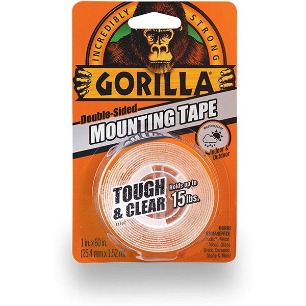 Gorilla Tough & Clear Mounting Tape is a clear double-sided tape that mounts in an instant, for a long-lasting, weatherproof bond. The crystal clear adhesive tape won't yellow over time. This mounting tape holds up to 15 pounds with the 60" roll, 38 pounds with the 150" roll, and 7 pounds for squares! Gorilla Tough & Clear Mounting Tape is perfect for indoor and outdoor projects and sticks to smooth and rough surfaces. Completing DIY projects is easy with this tough, double sided tape. Mount, build, and repair!