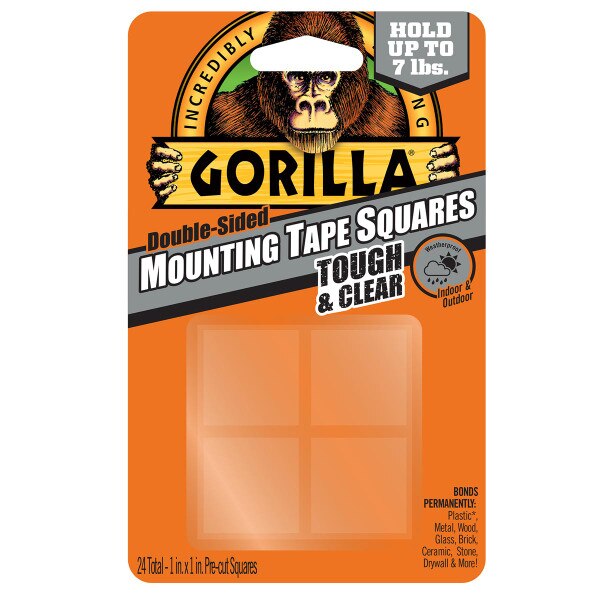 Gorilla Tough & Clear Mounting Tape is a clear double-sided tape that mounts in an instant, for a long-lasting, weatherproof bond. The crystal clear adhesive tape won't yellow over time. This mounting tape holds up to 15 pounds with the 60" roll, 38 pounds with the 150" roll, and 7 pounds for squares! Gorilla Tough & Clear Mounting Tape is perfect for indoor and outdoor projects and sticks to smooth and rough surfaces. Completing DIY projects is easy with this tough, double sided tape. Mount, build, and repair!