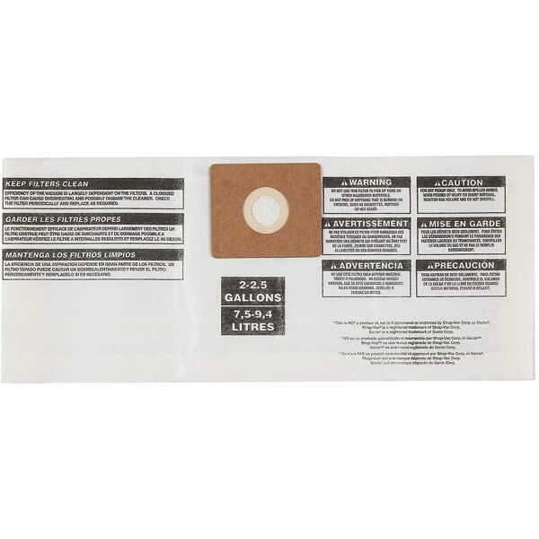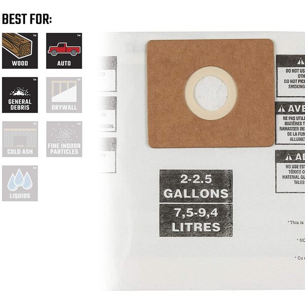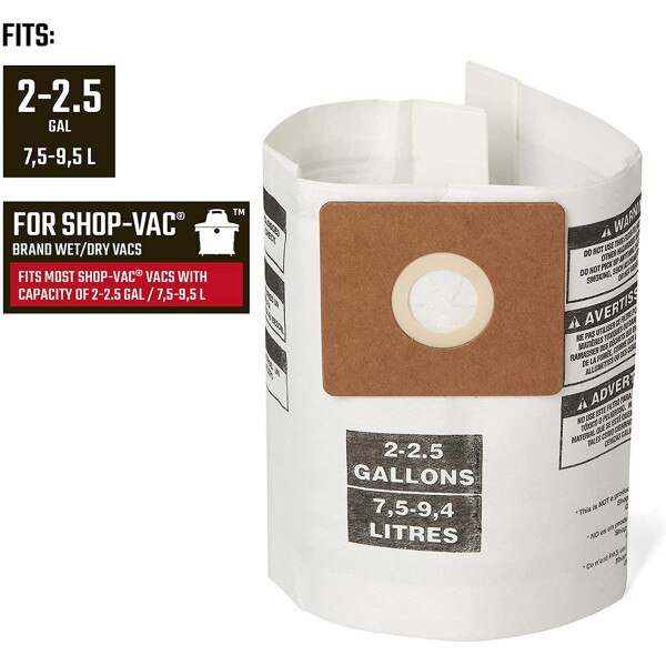 Craftsman General Purpose Dust Collection Bag for 2 to 2.5 Gallon Wet / Dry Shop Vacuum SKU 260840 SELL UNITS: Each $15.99 Quantity discounts available QuantityPrice (0)No Reviews yet Ship 67 Available Pickup in Store - FREE! Select Store to check availability. Selected Pickup Location Quantity -+ Add to Cart Details Collection bags fit most 2 to 2.5 gallon Shop-Vac brand vacsDesigned for pick-up of everyday dirt and other dry debris pick-upTrap debris conveniently... Details Back DetailsCollection bags fit most 2 to 2.5 gallon Shop-Vac brand vacsDesigned for pick-up of everyday dirt and other dry debris pick-upTrap debris conveniently for easy disposalEasy to install by attaching to vacuum port inside tank without any tools Ratings & ReviewsNo reviews availableBe the first to Write a Review