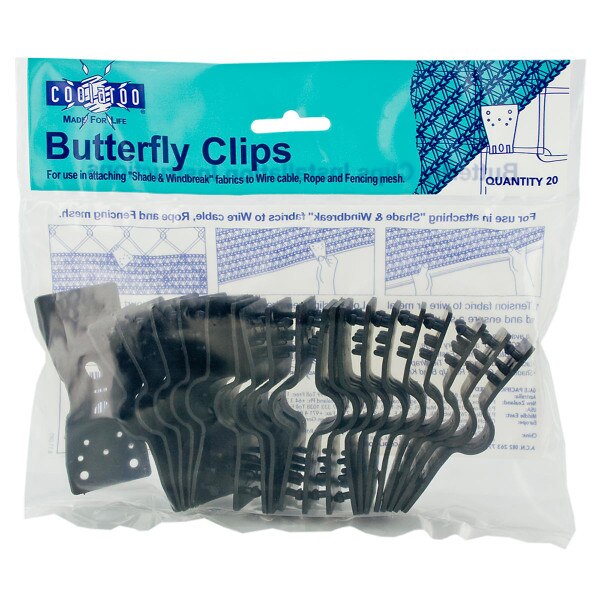 Black Shade Fabric Butterfly Clips 20 Count SKU 551588 SELL UNITS: Each $8.99 Quantity discounts available QuantityPrice (0)No Reviews yet Ship 52 Available Pickup in Store - FREE! Select Store to check availability. Selected Pickup Location Quantity -+ Add to Cart Details Butterfly clipsFast and easy way to attach your shade fabric to a variety of fixtures including chain link fences and cablesGripping teeth holds fabri... Details Back DetailsButterfly clipsFast and easy way to attach your shade fabric to a variety of fixtures including chain link fences and cablesGripping teeth holds fabric tight to ensure a secure attachmentUV stabilized for lasting durabilityHigh impact plastic provide a long lifeBlack20 count Ratings & ReviewsNo reviews availableBe the first to Write a Review