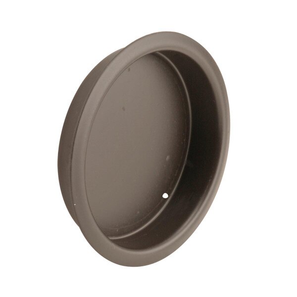 This is a stamped steel 2 inch round door pull with a Classic Bronze finish. It is pressed into the 2-1/8 inch diameter hole in the closet door and held in by a set of nails. Silicone glue may be required if the hole has worn larger. It has a Classic Bronze finish and used on many closet door manufacturer's doors. There are 2 pulls and 4 nails per package.