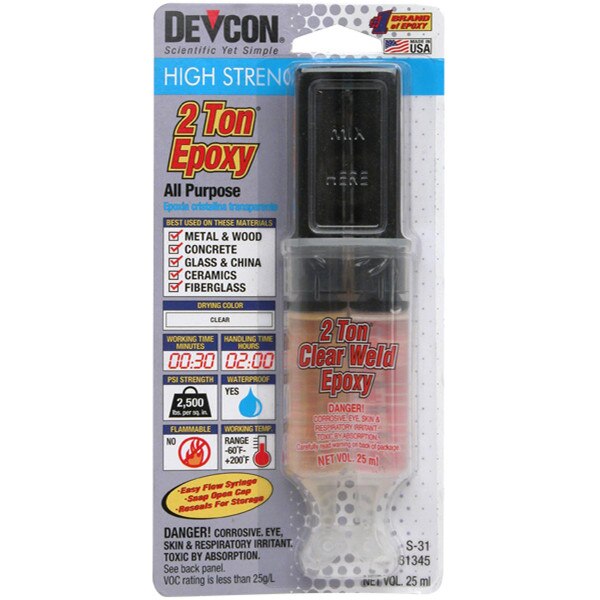 High Strength 2-Ton Crystal Clear Epoxy SKU 751058 SELL UNITS: Each $6.99 Quantity discounts available QuantityPrice (0)No Reviews yet Ship 58 Available Pickup in Store - FREE! Select Store to check availability. Selected Pickup Location Quantity -+ Add to Cart Details Designed for especially difficult repairs and home projectsIndustrial, high strength, dependable and easy to useNo Measuring, unique Dev-Tube does it ... Details Back DetailsDesigned for especially difficult repairs and home projectsIndustrial, high strength, dependable and easy to useNo Measuring, unique Dev-Tube does it for you1 oz Ratings & ReviewsNo reviews availableBe the first to Write a Review
